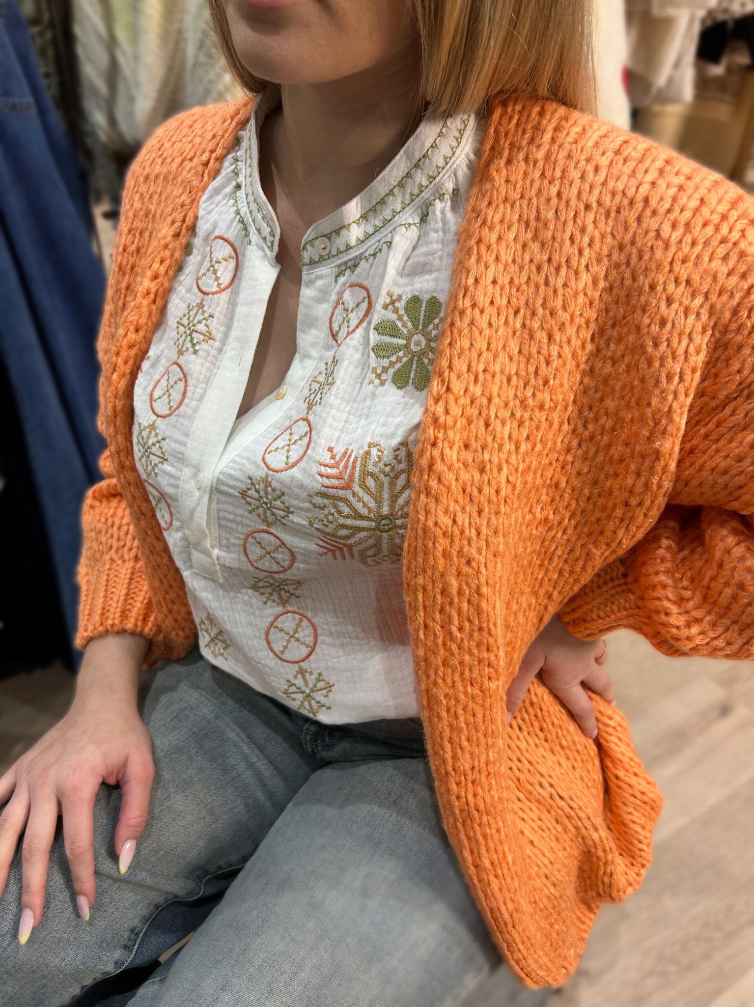 Chemise blanche en coton léger, sublimée par de délicates broderies bohèmes aux tons chauds, idéale pour un look chic et naturel.