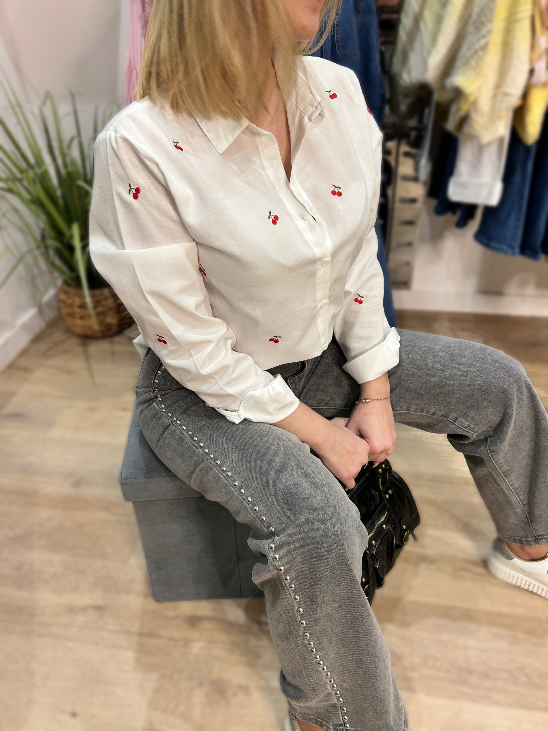 La chemise CHERRY pleine de fraîcheur, décorée de petites cerises brodées pour une touche fun et délicate.