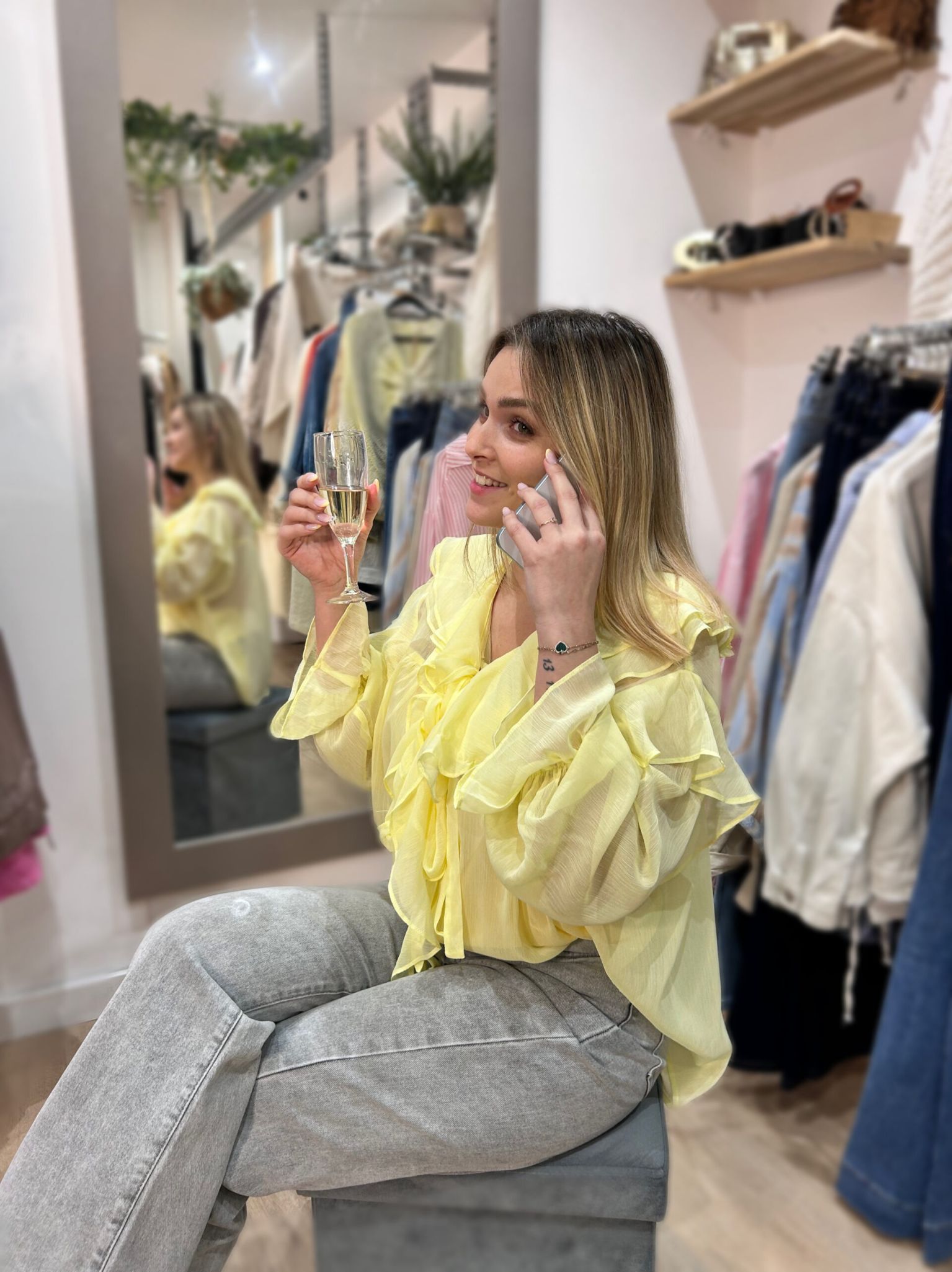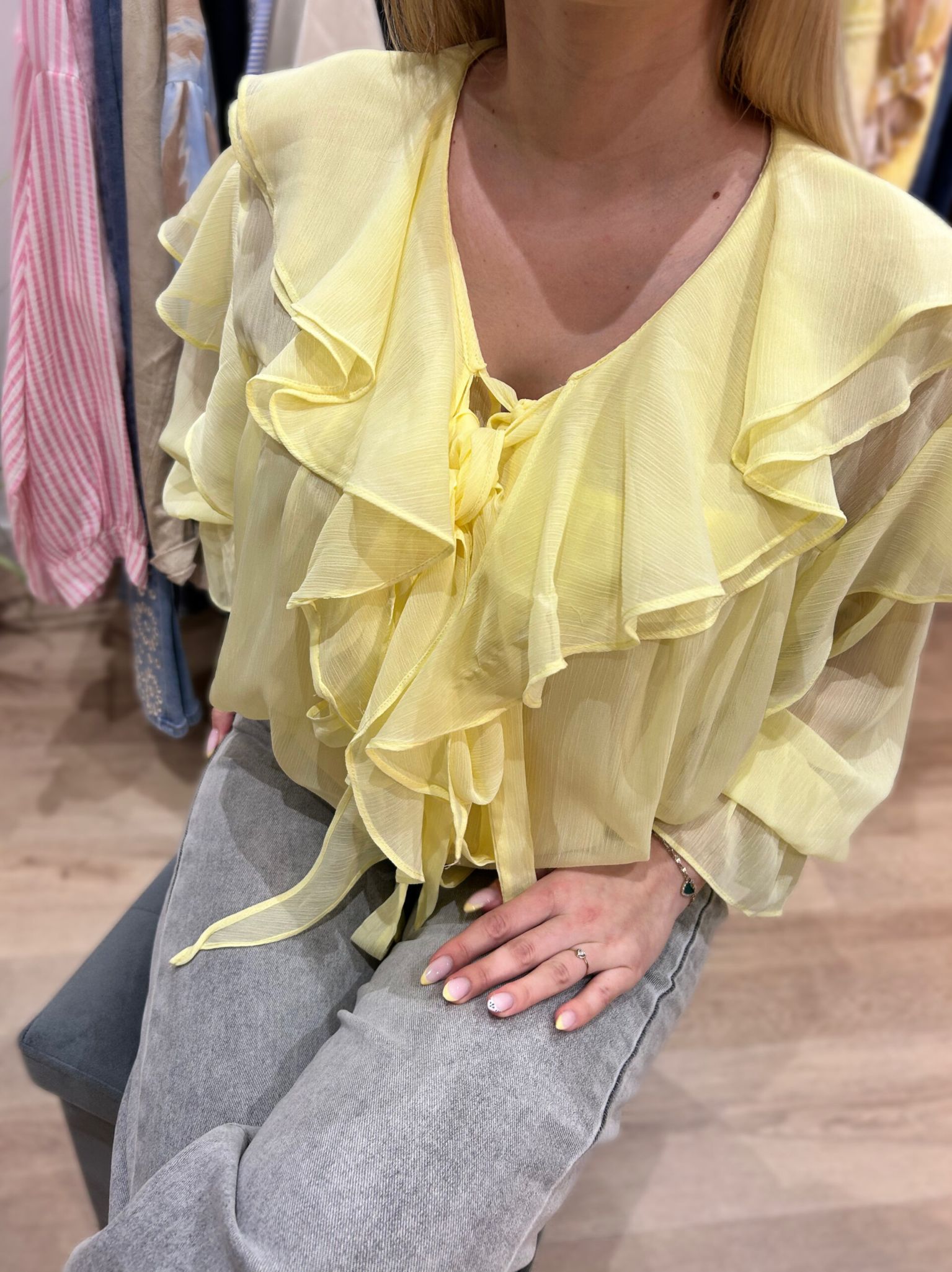 Chemisier jaune pastel en voile léger, ornée de volants délicats et d’un lien à nouer pour une allure douce et féminine.