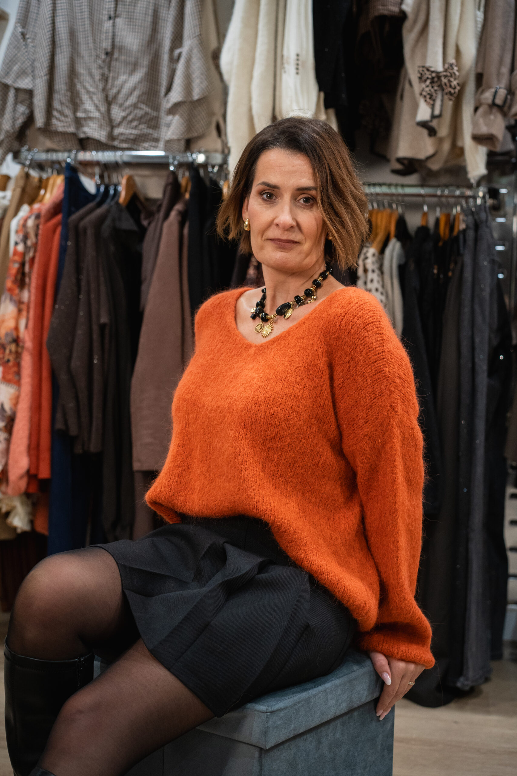 Notre mannequin mesure 1,57 et porte le pull en taille unique qui convient du 36 au 42