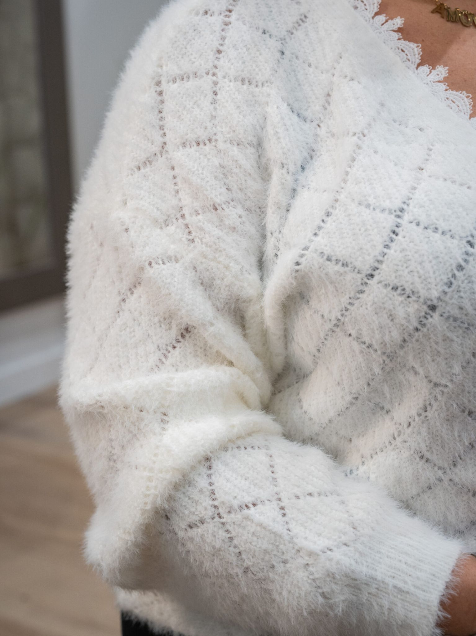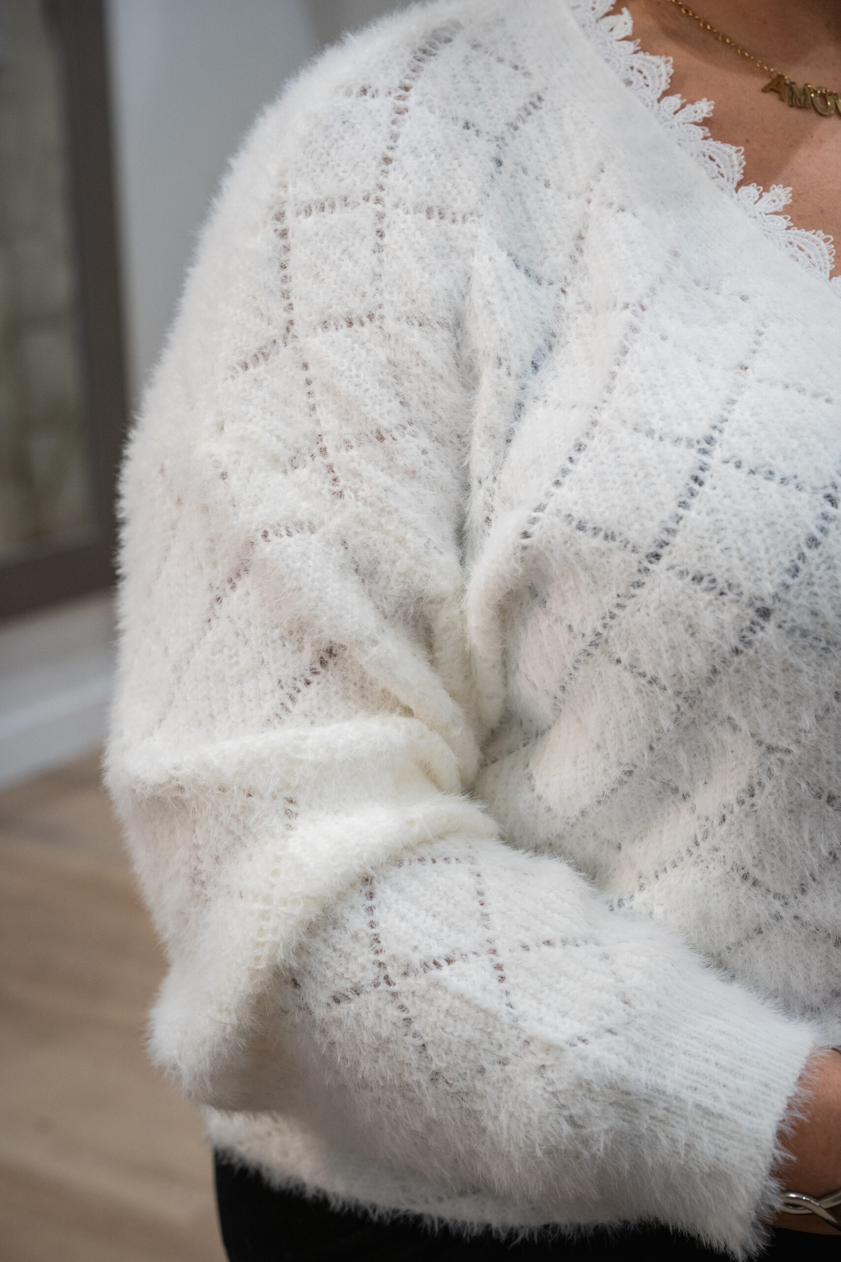 Son détail de dentelle sur le décolleté, et ses perles en guise de bouton, font toute la différence.