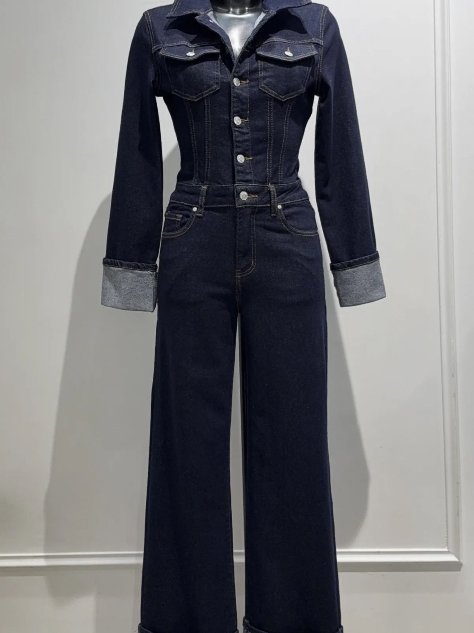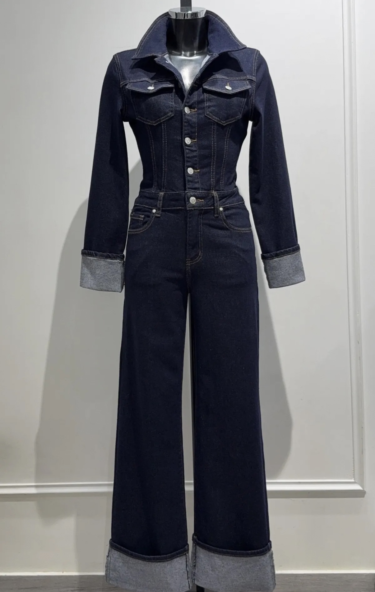 Combinaison Wide leg en jean stretch très souple avec revers ( seulement cousu par un point donc facilement retirable pour les longues jambes….)